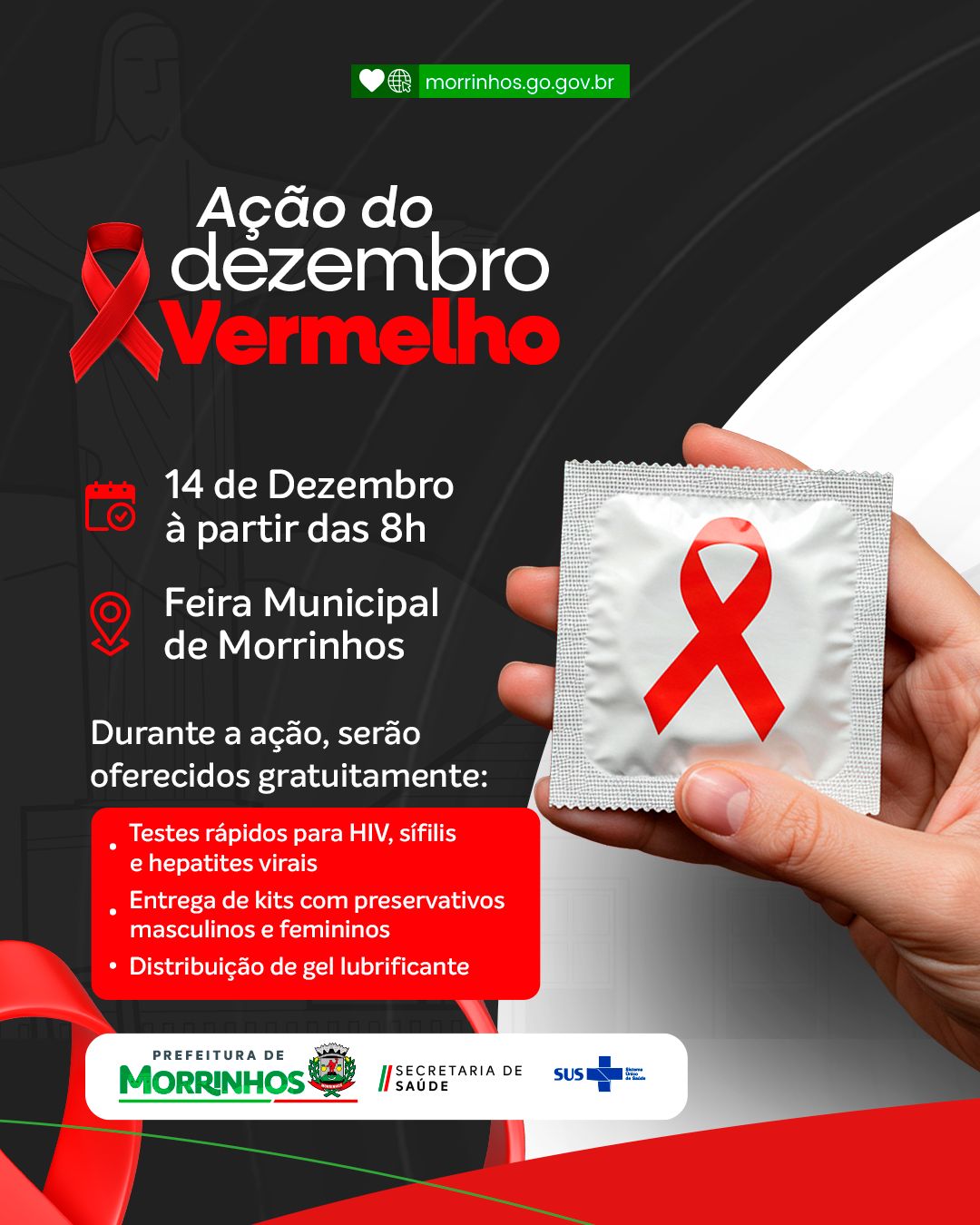 #Morrinhos Prefeitura de Morrinhos realiza ação do Dezembro Vermelho na Feira Municipal neste domingo (14) A Prefeitura de Morrinhos, por meio da Secretaria Municipal de Saúde, promove neste domingo (14), das 8h às 12h, uma Adagmar / 4 semanas Comment (0)